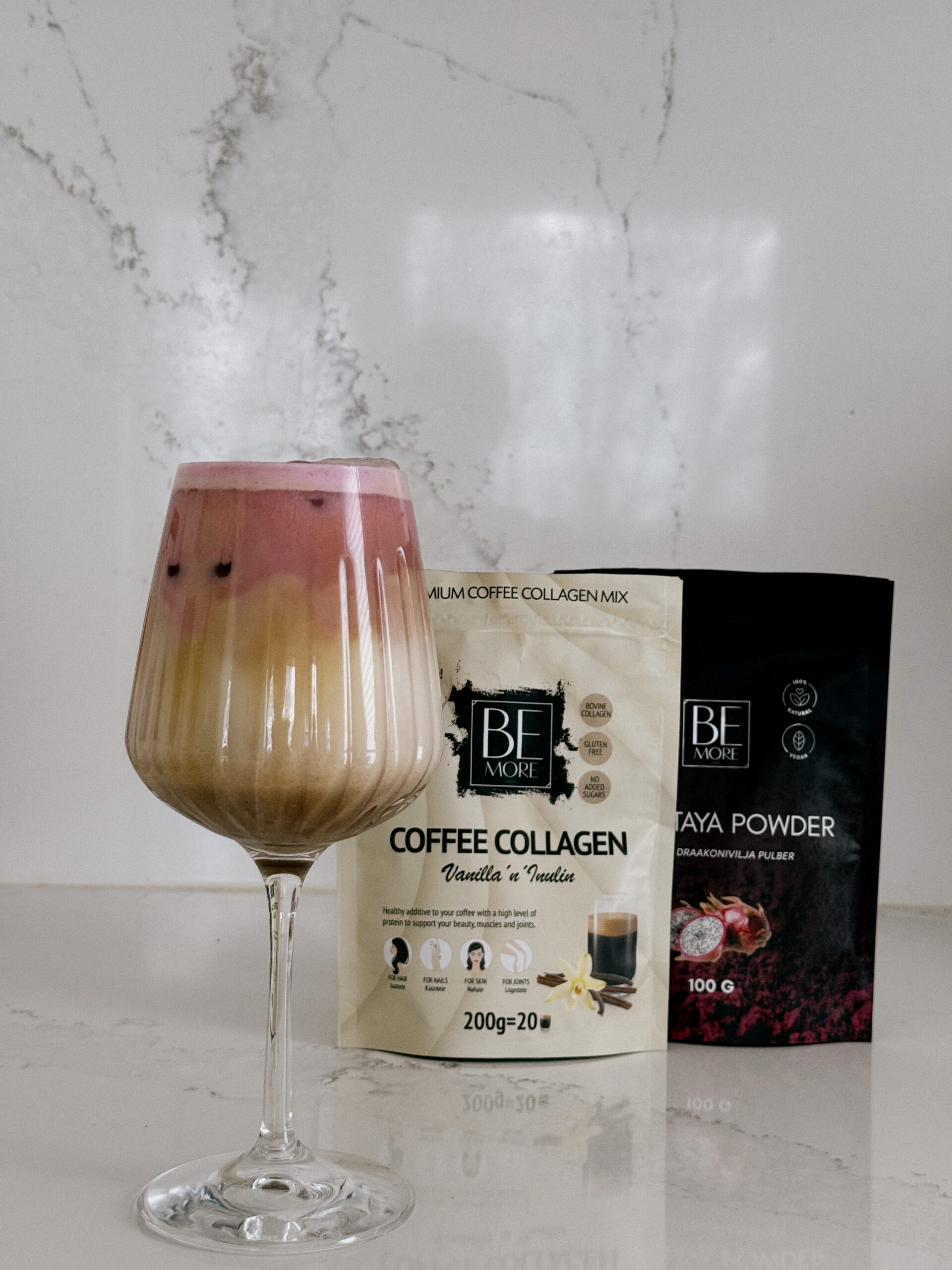 Valmistamine: Valmista kohv ja lisa sellele 1 tl Be More kohvikollageeni. Jäta kohv korraks kõrvale jahtuma. Sega klaasis kokku piim ja 1 spl Pink Pitaya pulbrit. Eriti õhulise piimavahu saamiseks kasuta piimavahustajat või kohvimasina piimavahustamise funktsiooni. Lisa klaasi jääkuubikud, vala peale kohv ning seejärel piim. Lõpuks lisa peale roosa vaht ja naudi koheselt! Kevadiselt värske, kaunis ja mõnusalt kosutav jook!