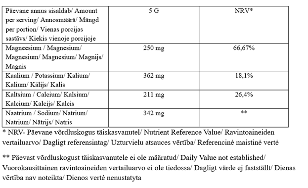 Tarvitamisjuhis: segage 5 grammi (umbes 1 tasane teelusikatäis) pulbrit 1 liitri veega. Tarbige kogu päeva vältel, et toetada elektrolüütide tasakaalu, energiat ja vedelikuvarusid.